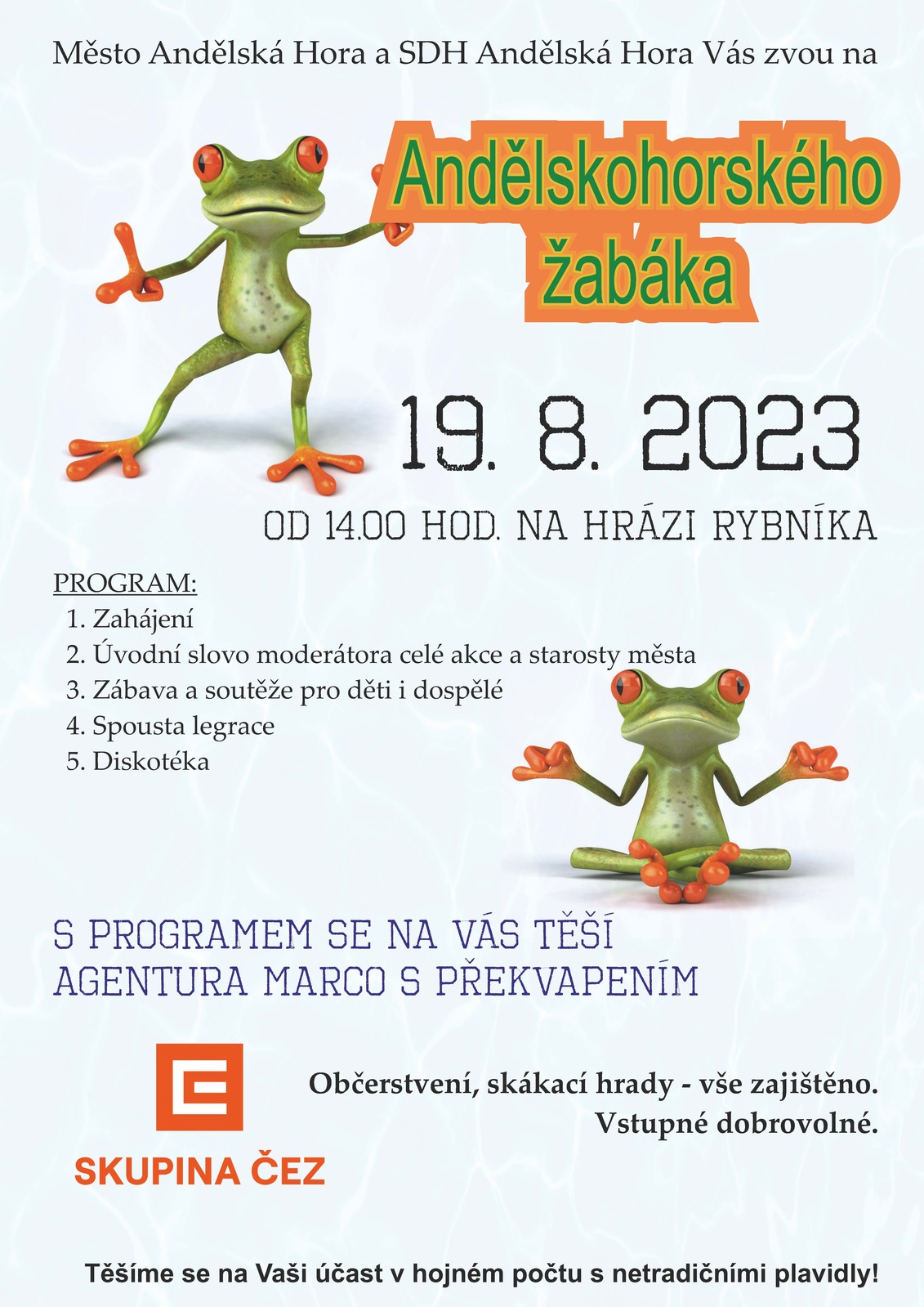 Město Andělská Hora a SDH Andělská Hora vás zvou na ANDĚLSKOHORSKÉHO ŽABÁKA, který se koná v sobotu 19.8.2023 od 14 hodin na hrázi rybníka.