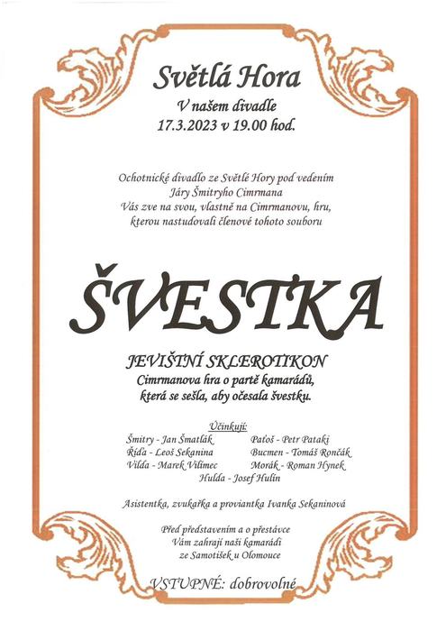 Ochotnické divadlo ze Světlé Hory vás zve na Cimrmanovu hru ŠVESTKA, kterou nastudovali členové tohoto souboru 17. března v 19 hodin v kulturním sále ve Světlé Hoře. Více zde