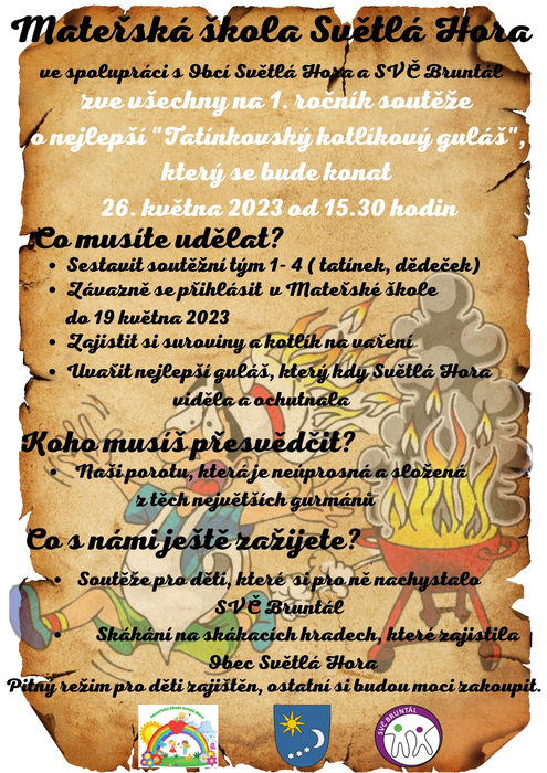 Mateřská škola Světlá Hora ve spolupráci s Obcí Světlá Hora a SVČ Bruntál zve všechny na 1. ročník soutěže o nejlepší "Tatínkovský kotlíkový guláš", který se bude konat v pátek 26. května 2023 od 15.30 hodin na zahradě mateřské školky.