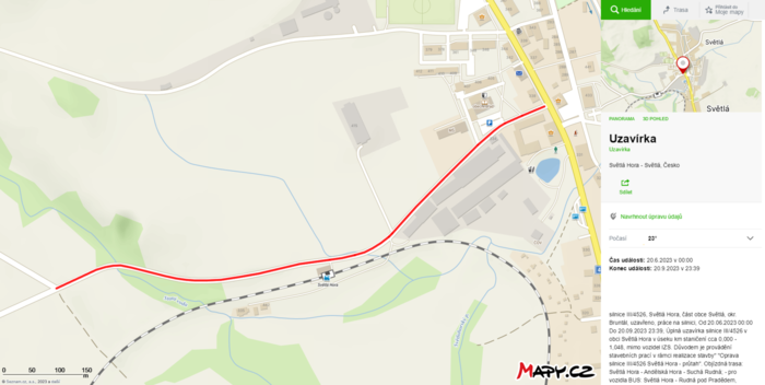 Od pondělí, 24.7.2023 do odvolání, bude úsek silnice od křižovatky dolní Hruška (sběrný dvůr) ke školce zcela uzavřen. Možná objízdná trasa s omezením je kolem konírny a vlakového nádraží.