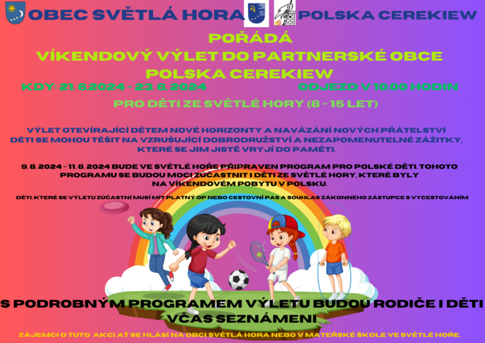 Obec Světlá Hora pořádá ve dnech 21.6 - 23.6.2024 víkendový výlet do partnerské obce Polska Cerekiew. Výlet je určen pro děti ze Světlé Hory ve věku 8 - 15 let. Přihlášku odevzdejte v Mateřské škole Světlá Hora nebo na OÚ ve Světlé Hoře.